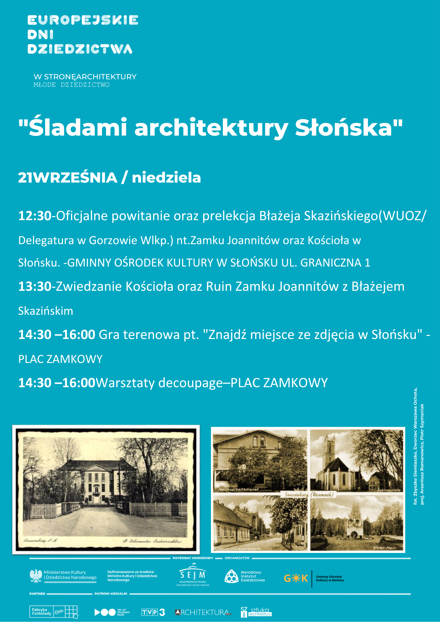 Szanowni Państwo, mamy zaszczyt zaprosić na wydarzenie pod hasłem „Śladami architektury Słońska”, które odbędzie się w ramach Europejskich Dni Dziedzictwa w niedzielę, 21 września 2025 „Europejskie Dni Dziedzictwa 2025”